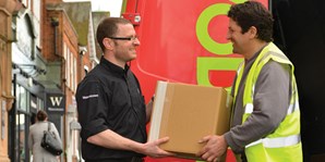 Yodel driver, Paul Eadie, hands a World Book Night delivery to Waterstones’ St Albans’ store manager Sean Farrell.
