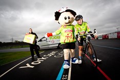 Sam received the merchandise from ToBi, the official Tour of Britain mascot and Wayne Hoskins from Yodel's Selby service centre (see image) at the York Sport Velodrome.